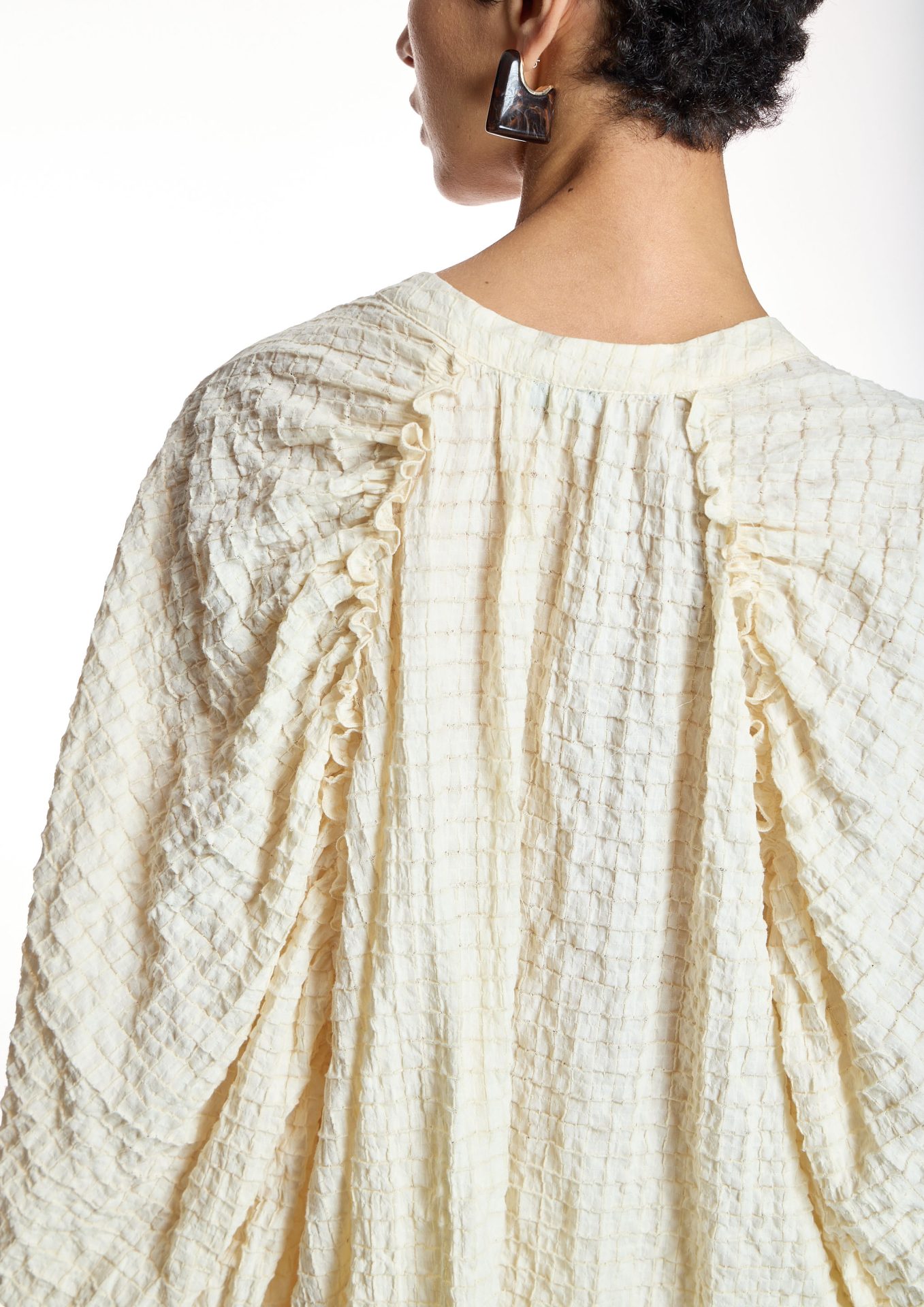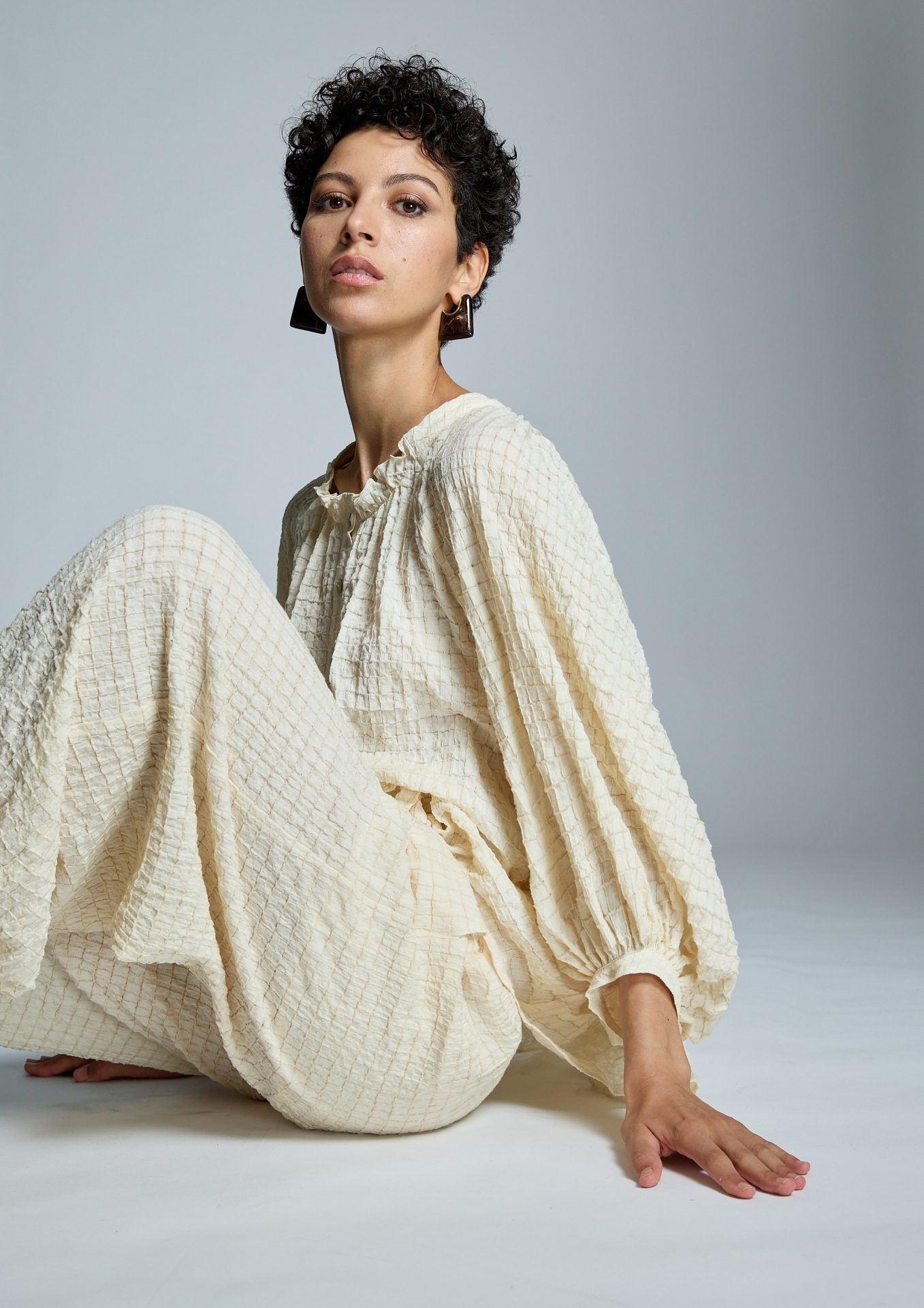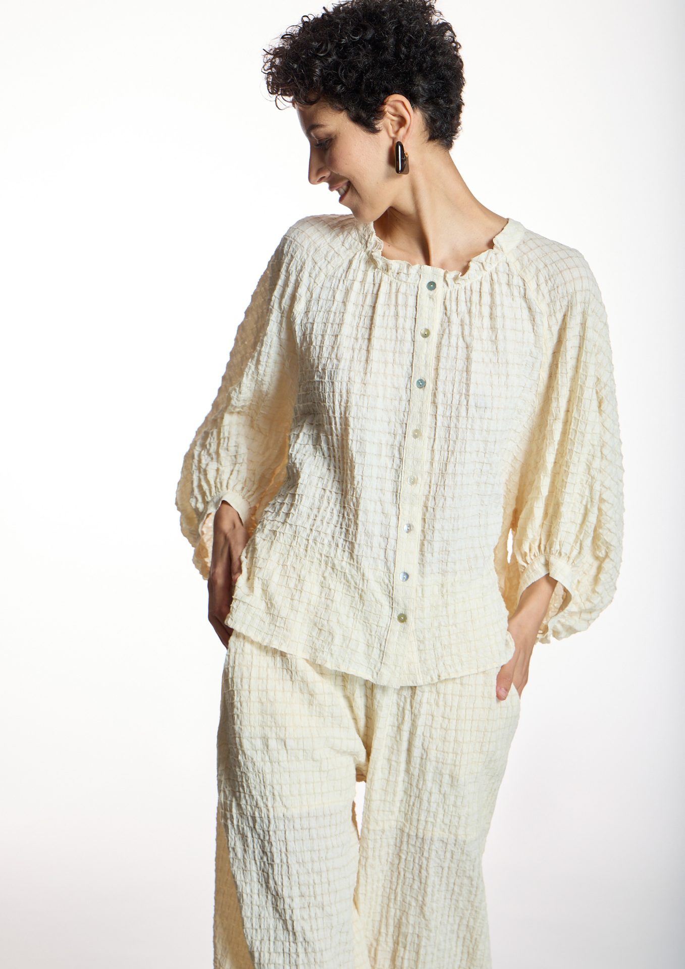 Blusa cruda de ALBA CONDE con diseño estructurado y corte amplio que combina elegancia y comodidad. Presenta escote redondo y cierre central con botonadura, aportando un estilo limpio y sofisticado.