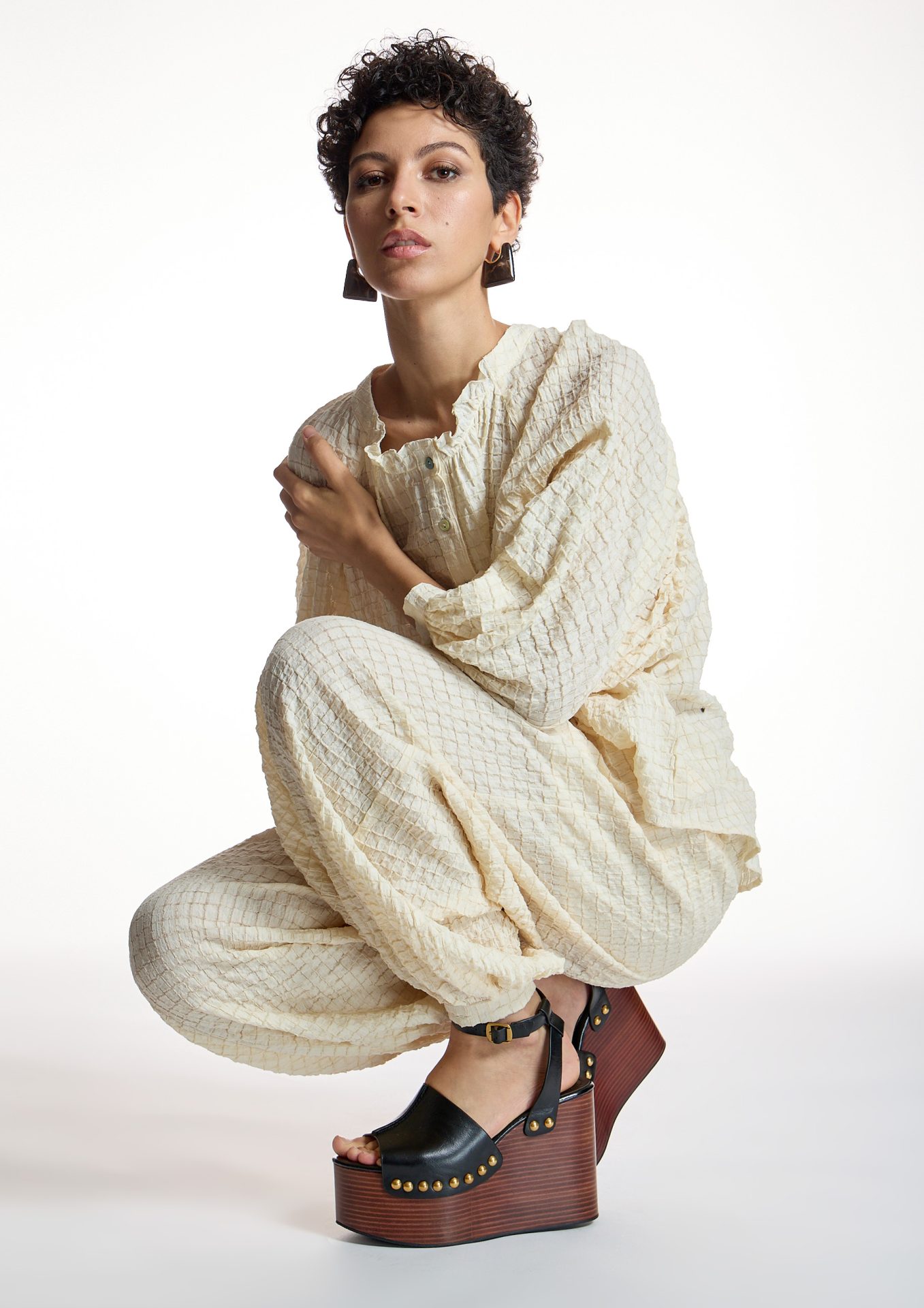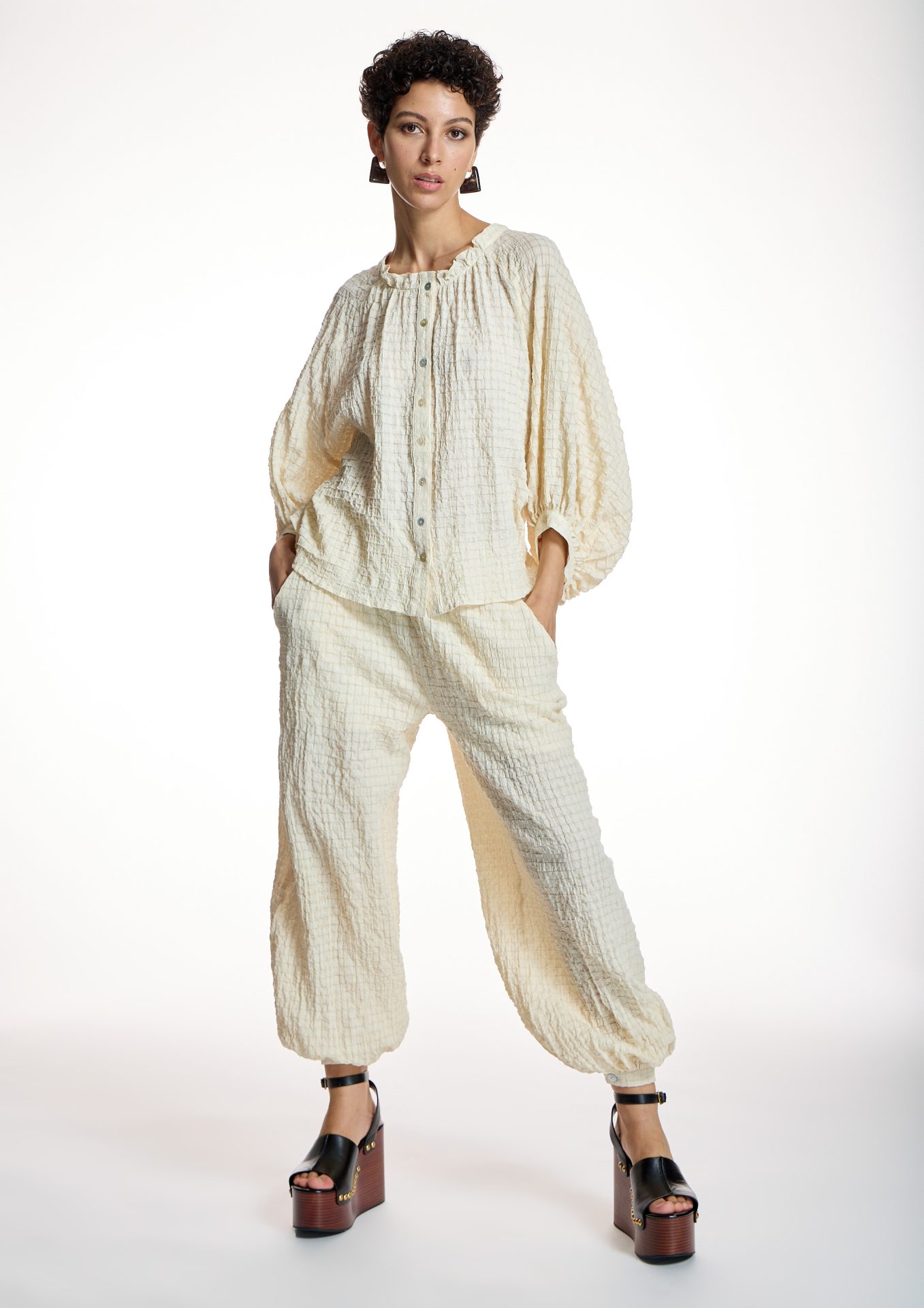 Pantalón bombacho de ALBA CONDE con textura arrugada que aporta un acabado natural y actual. Su diseño de corte relajado y silueta ligeramente amplia ofrece comodidad y estilo.