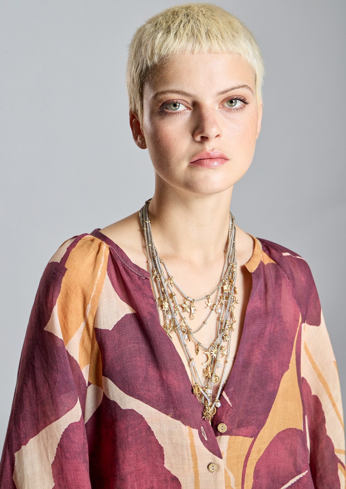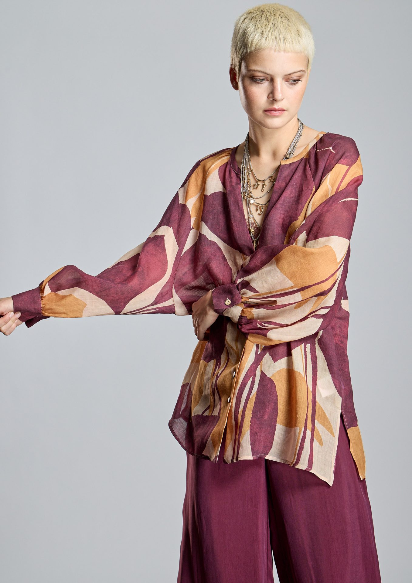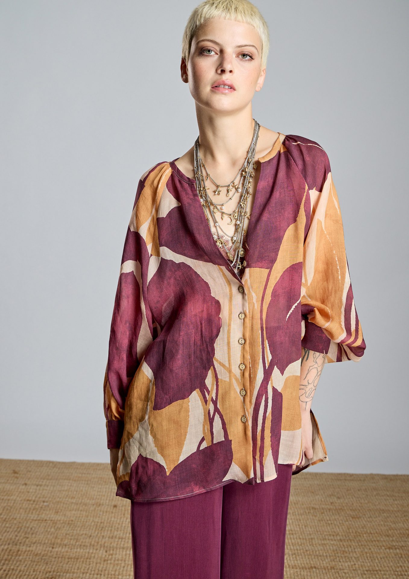 Confeccionada en voile ligero de mezcla de ramio en tonos salmón, granate y naranja, una combinación de colores que aporta frescura y personalidad.