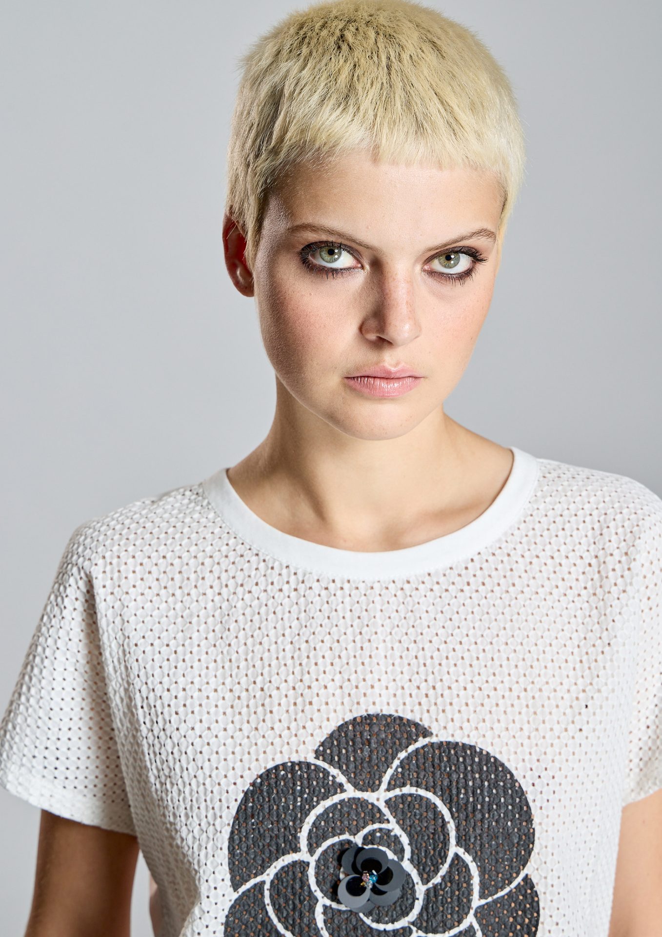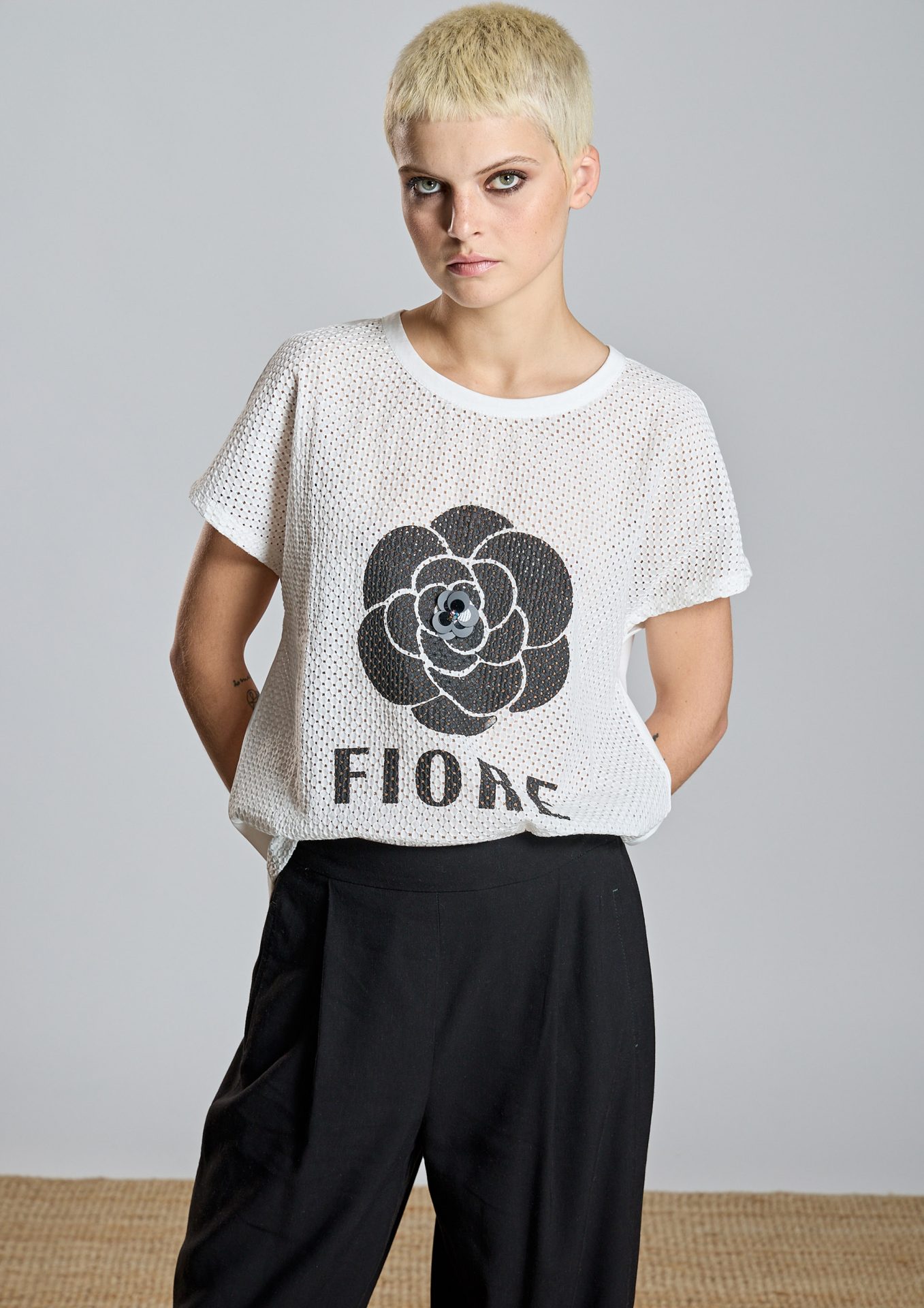 Camiseta AC de estructura calada con diseño gráfico frontal que aporta un estilo moderno y distintivo. Presenta cuello redondo y manga corta, creando una silueta cómoda y fácil de combinar.