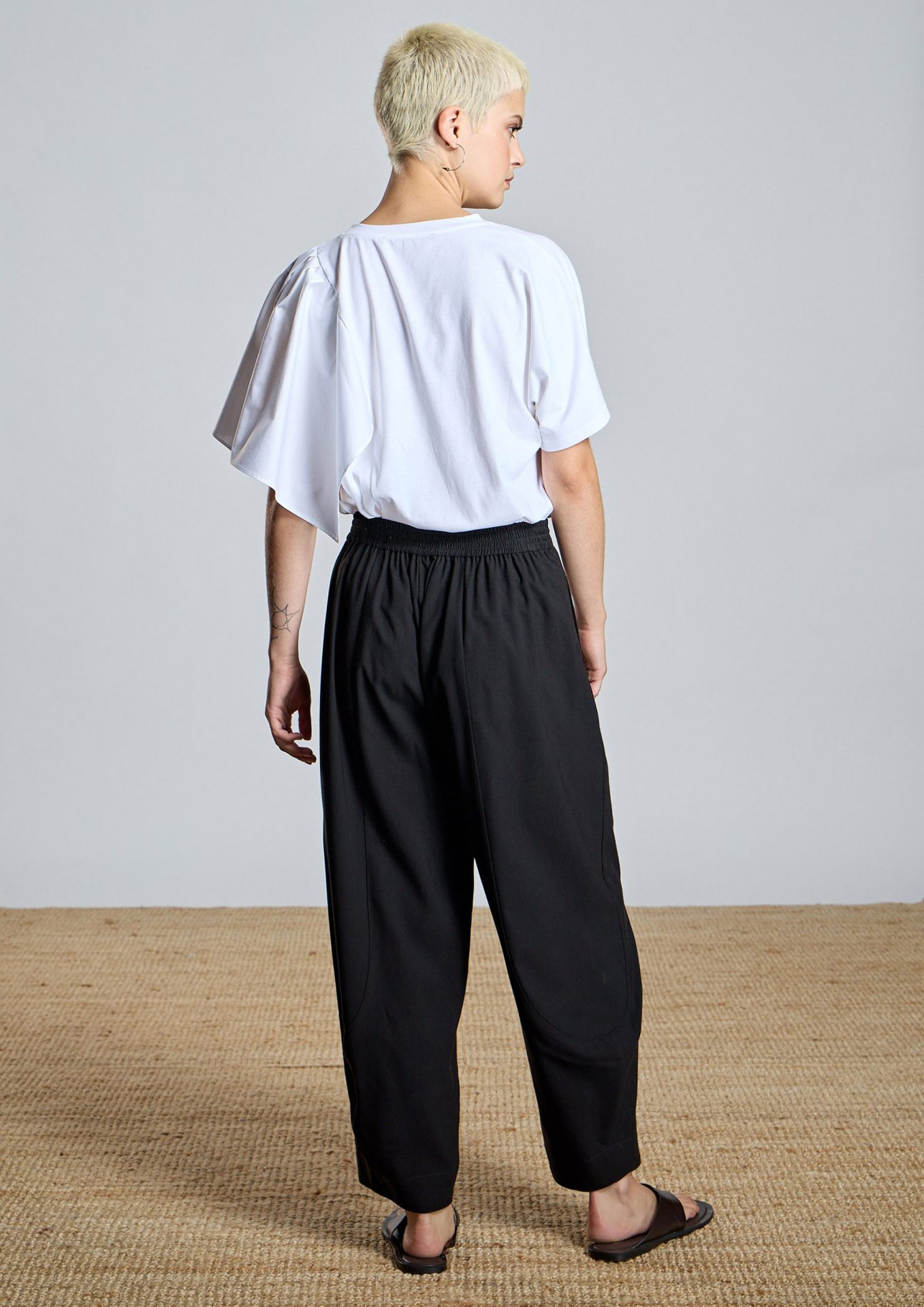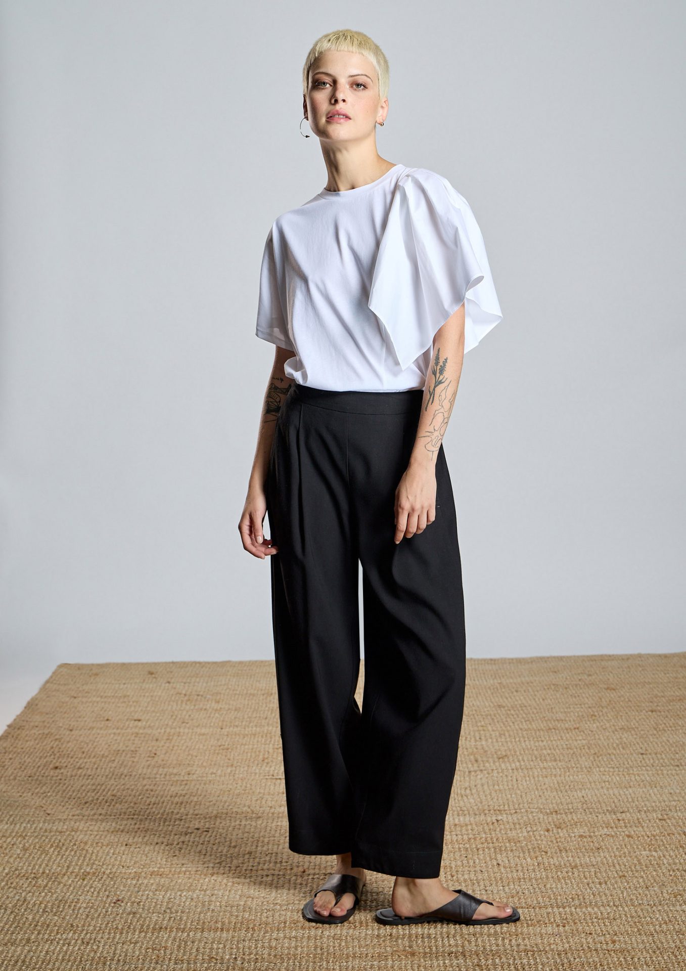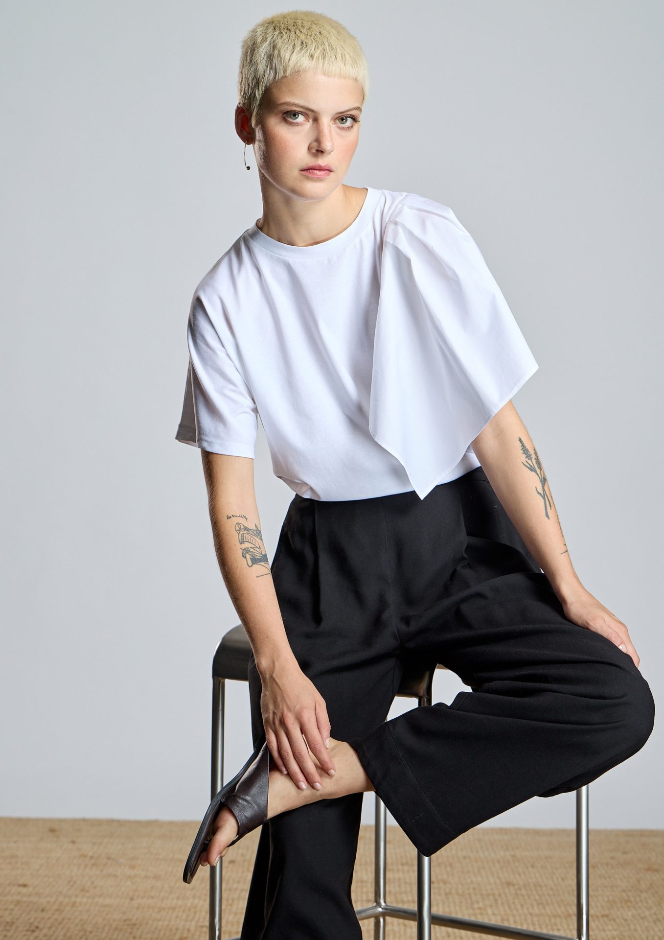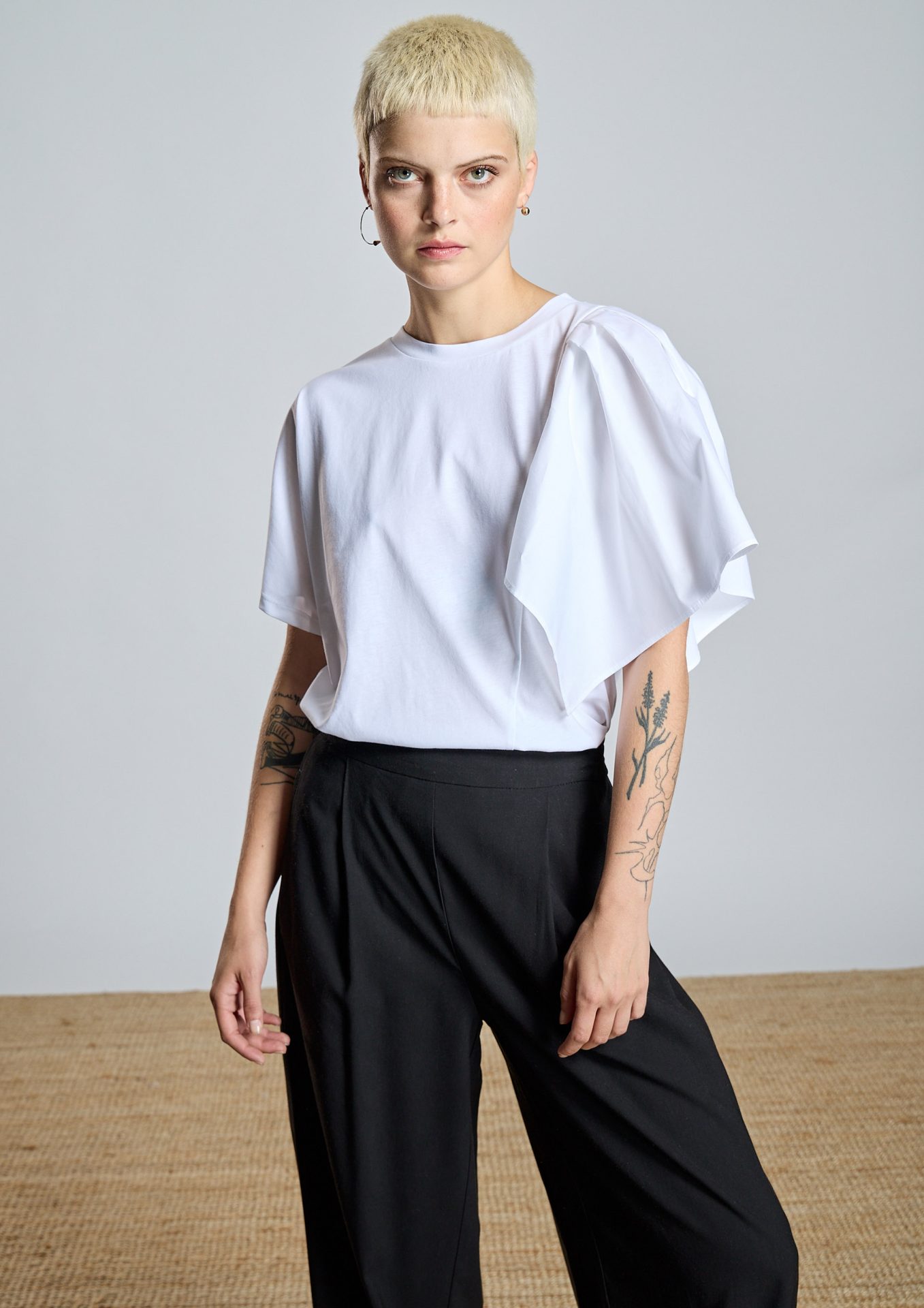 Camiseta combinada AC de manga corta con diseño asimétrico que aporta un toque moderno y sofisticado. Presenta escote redondo y un volante superpuesto en un hombro en popelín, creando volumen y un efecto contemporáneo.