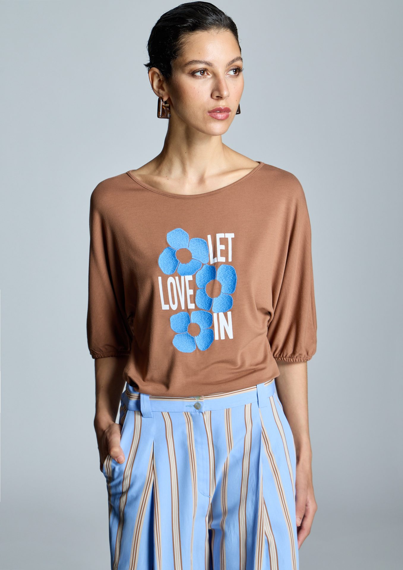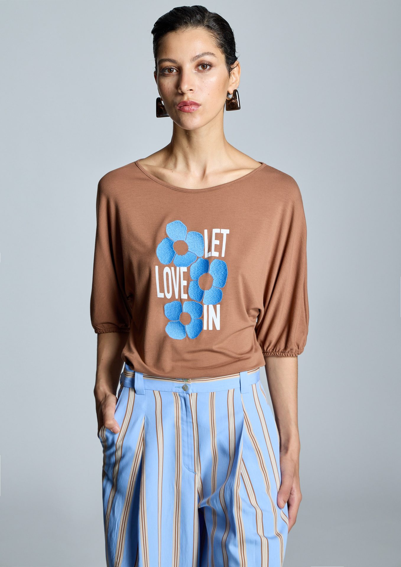Camiseta de ALBA CONDE en color marrón con delicado bordado floral en el delantero que aporta un toque femenino y distintivo.