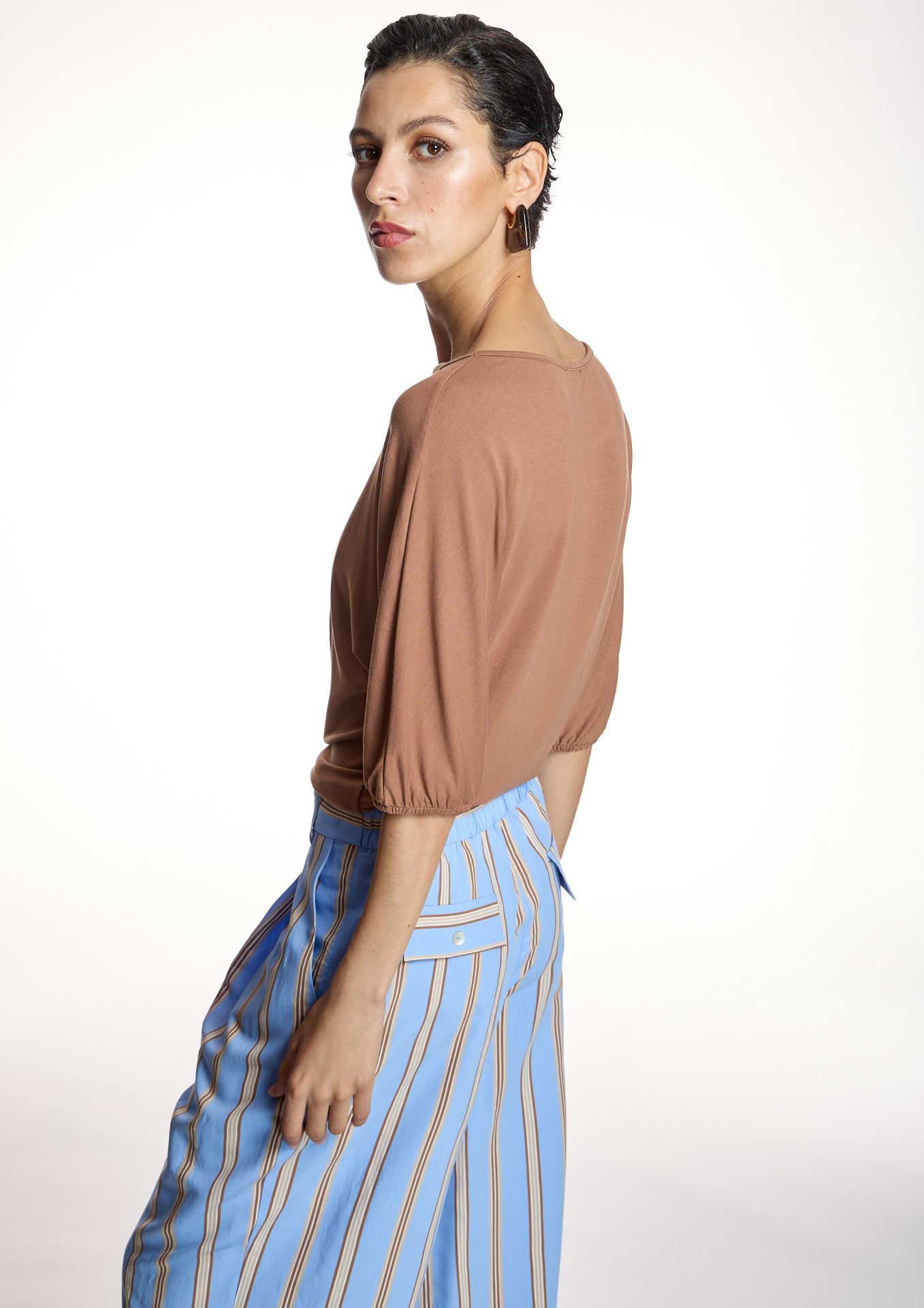 Presenta escote barco y manga francesa ligeramente abullonada con acabado elástico, creando una silueta cómoda y elegante.