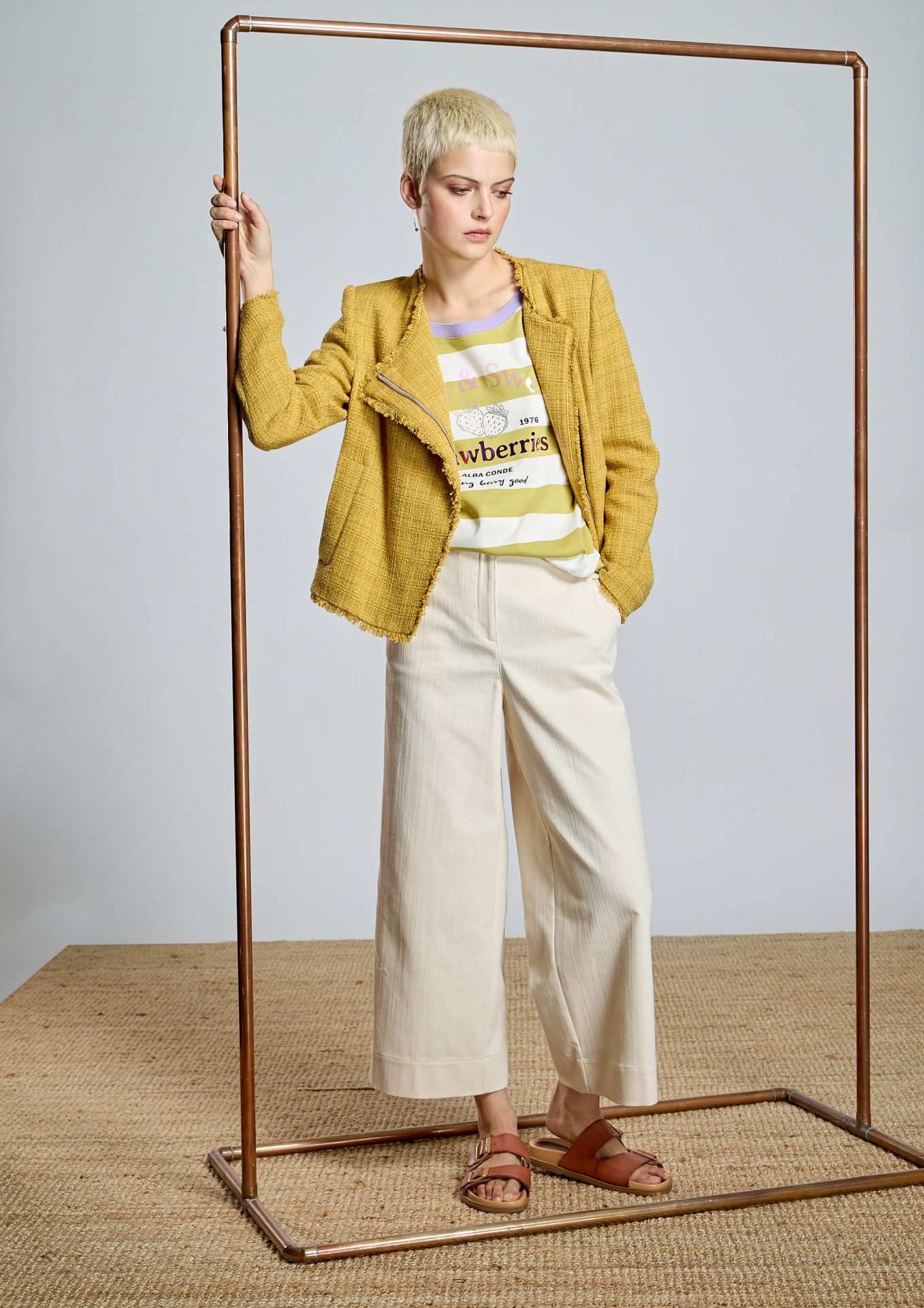 Confeccionada en punto de algodón de rayas en tonos crudo y oliva, es una prenda ligera y versátil con un aire veraniego y natural. ✨
