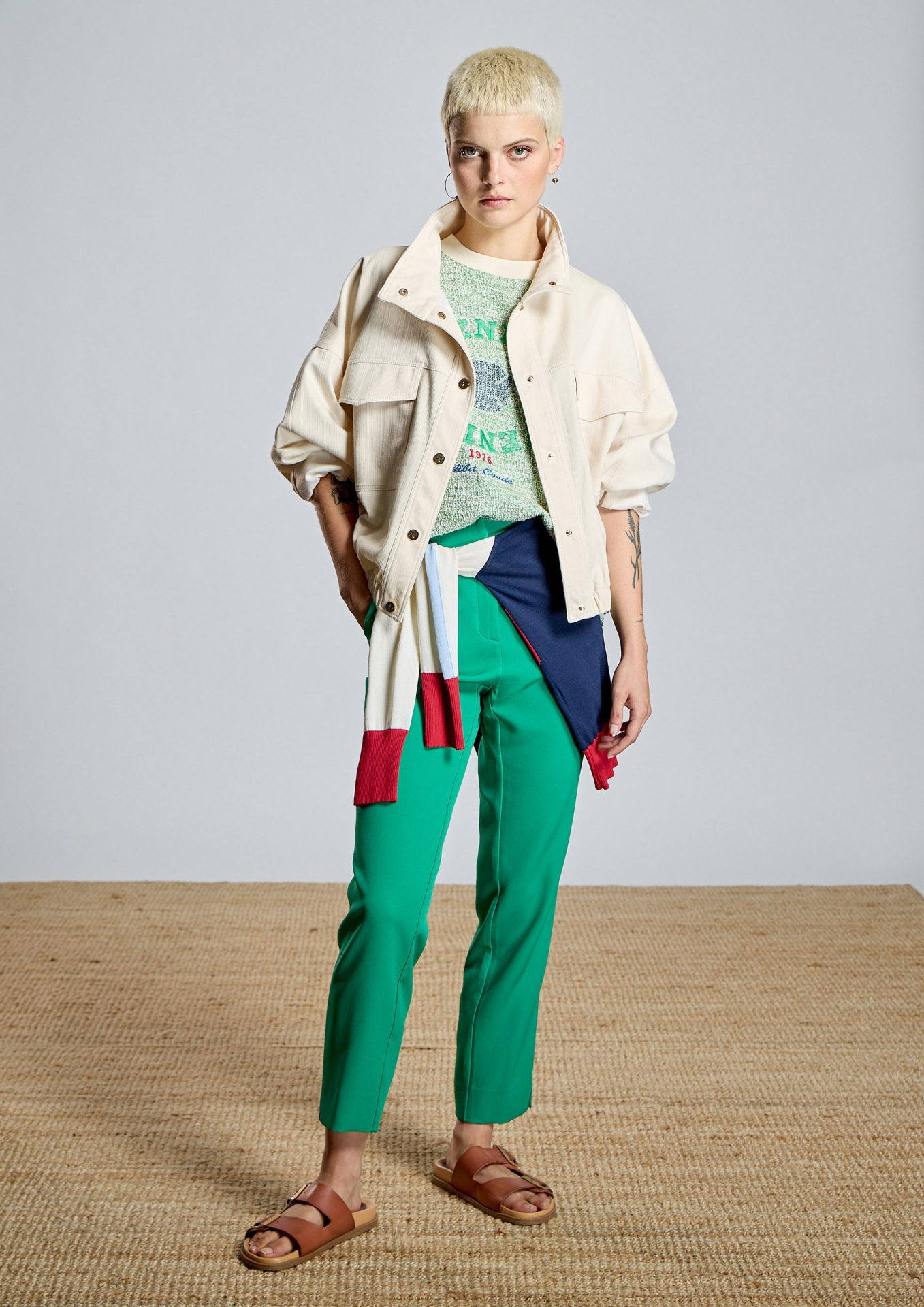 Presenta cuello alto con cordón elástico ajustable, cierre frontal con broches y bolsillos delanteros con solapa, además de bolsillos laterales en costura que refuerzan su carácter funcional. El bajo elástico fruncido aporta un acabado tipo bomber que equilibra el volumen y define la silueta.