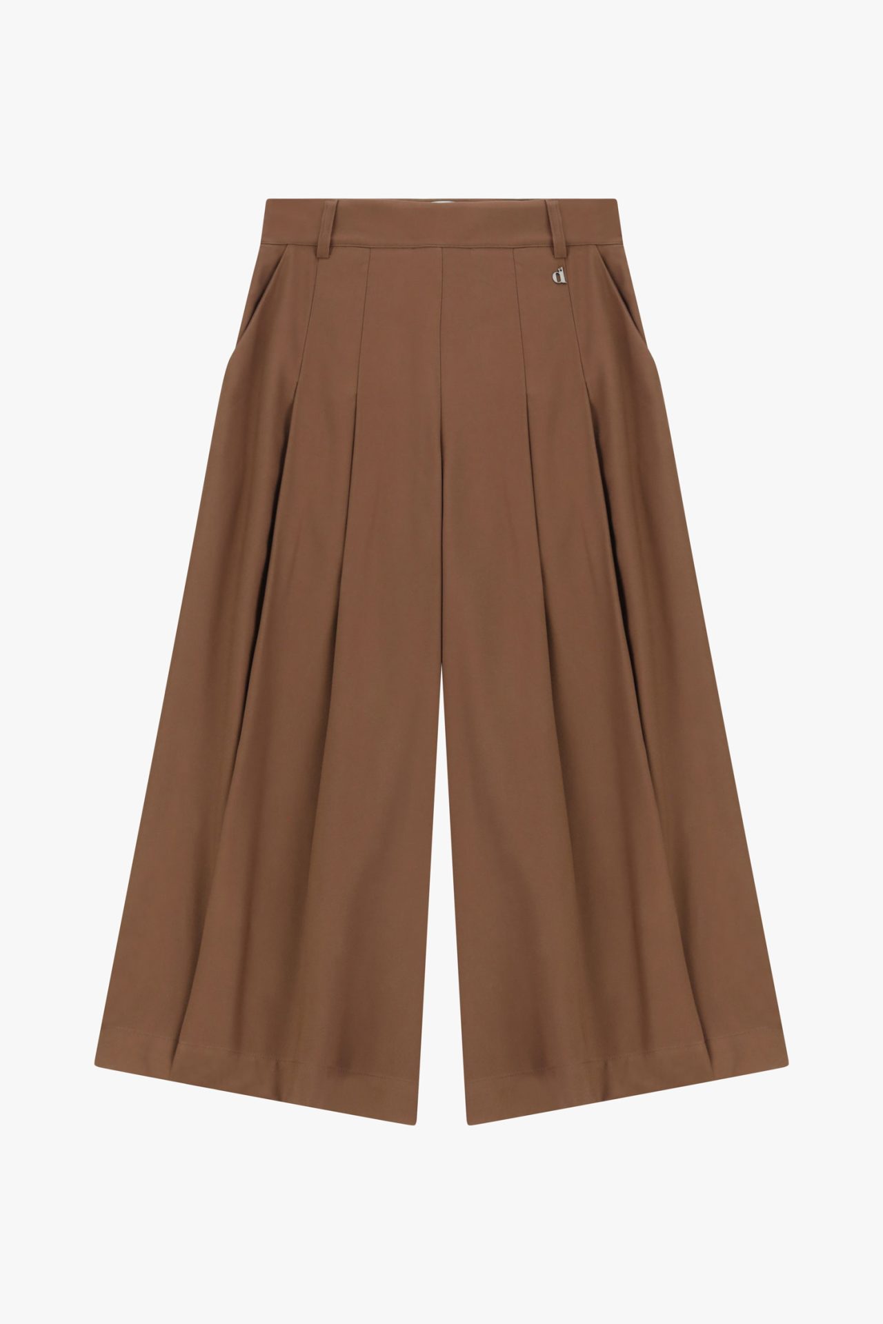 Pantalón culotte de corte amplio en tono marrón, diseñado para ofrecer una silueta elegante y contemporánea.