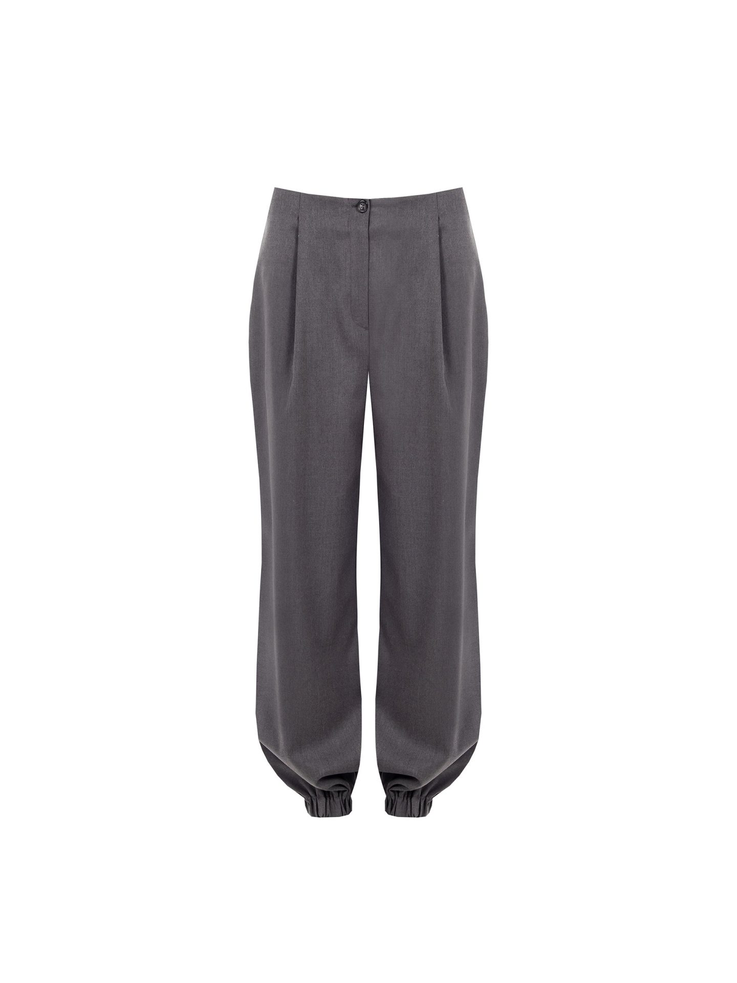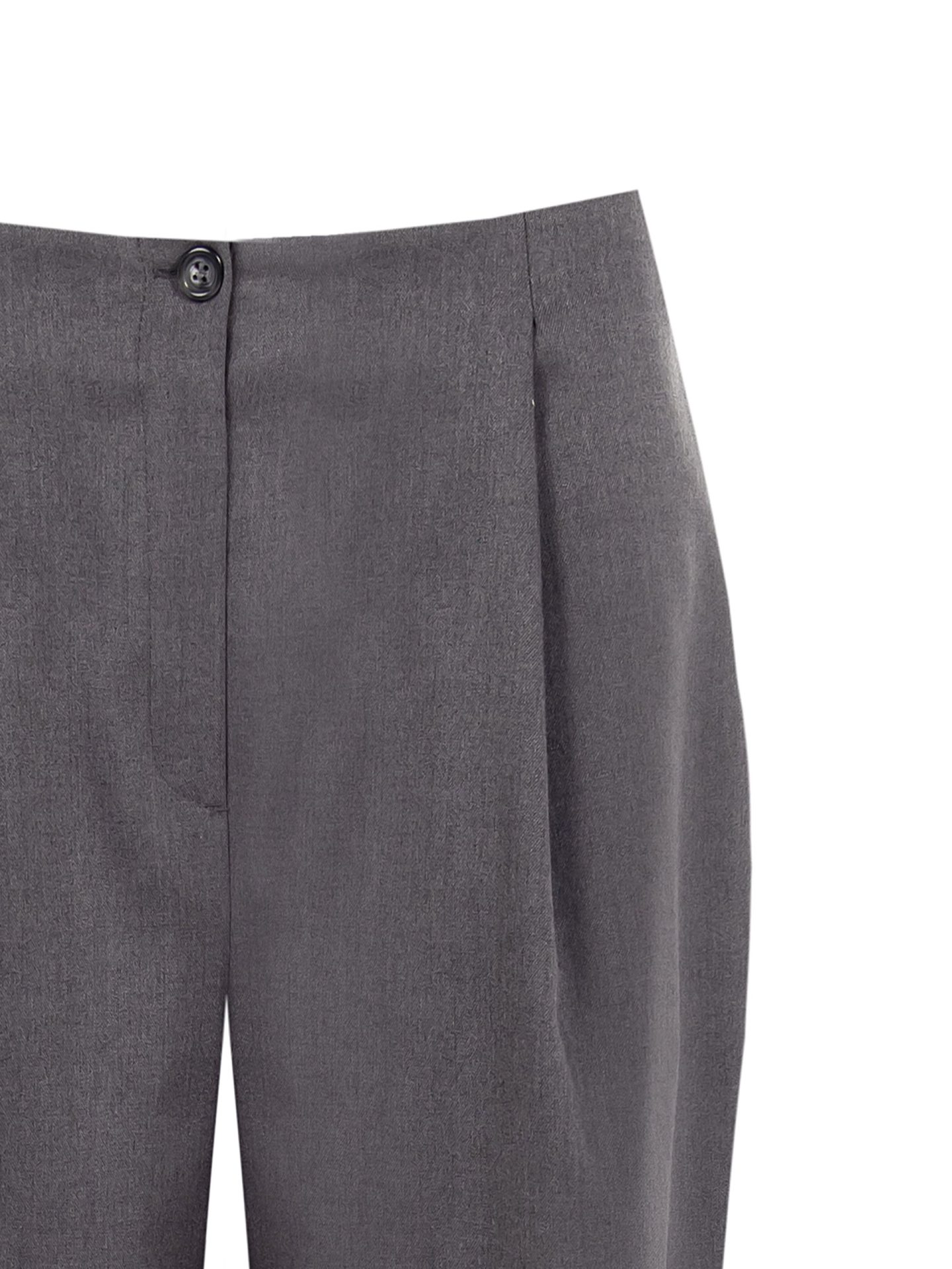 Diseño contemporáneo con silueta relajada y estructura sutil. Este pantalón en tono gris antracita presenta cintura alta con cierre frontal y botón, pinzas delanteras que aportan forma y una caída fluida que estiliza la figura.