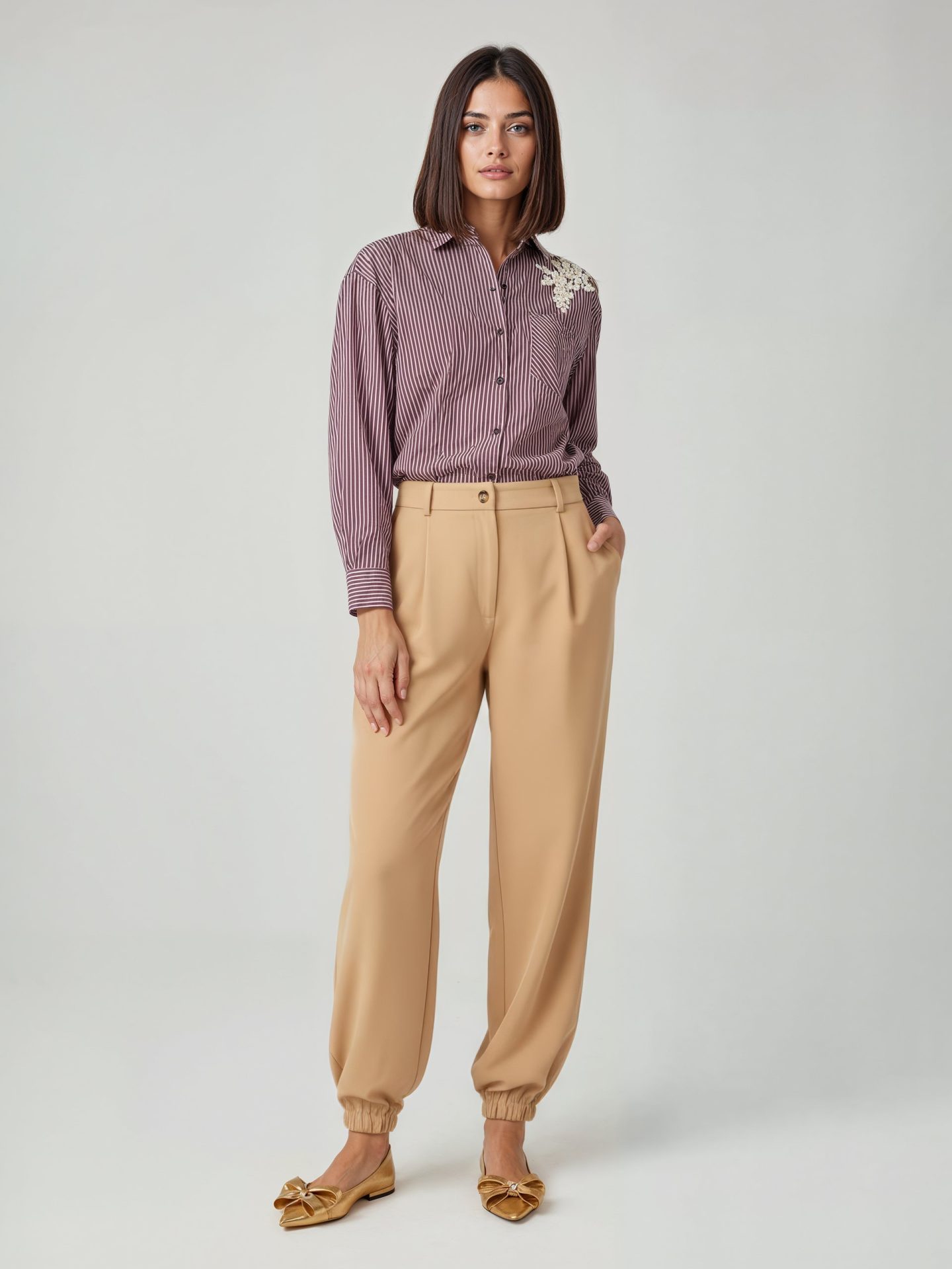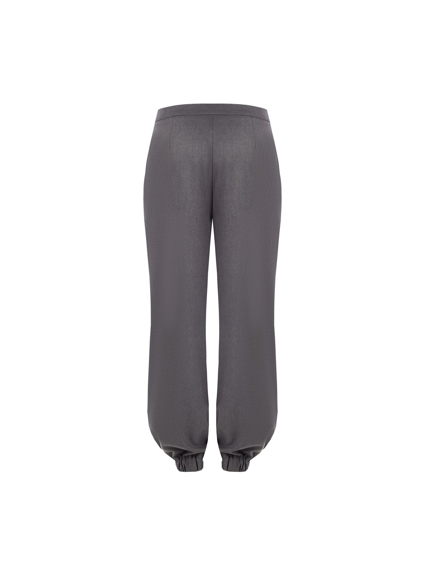 El detalle diferencial está en el bajo ligeramente fruncido con ajuste elástico, que redefine el clásico pantalón recto y le aporta un aire actual, casi sporty-chic, sin perder elegancia.