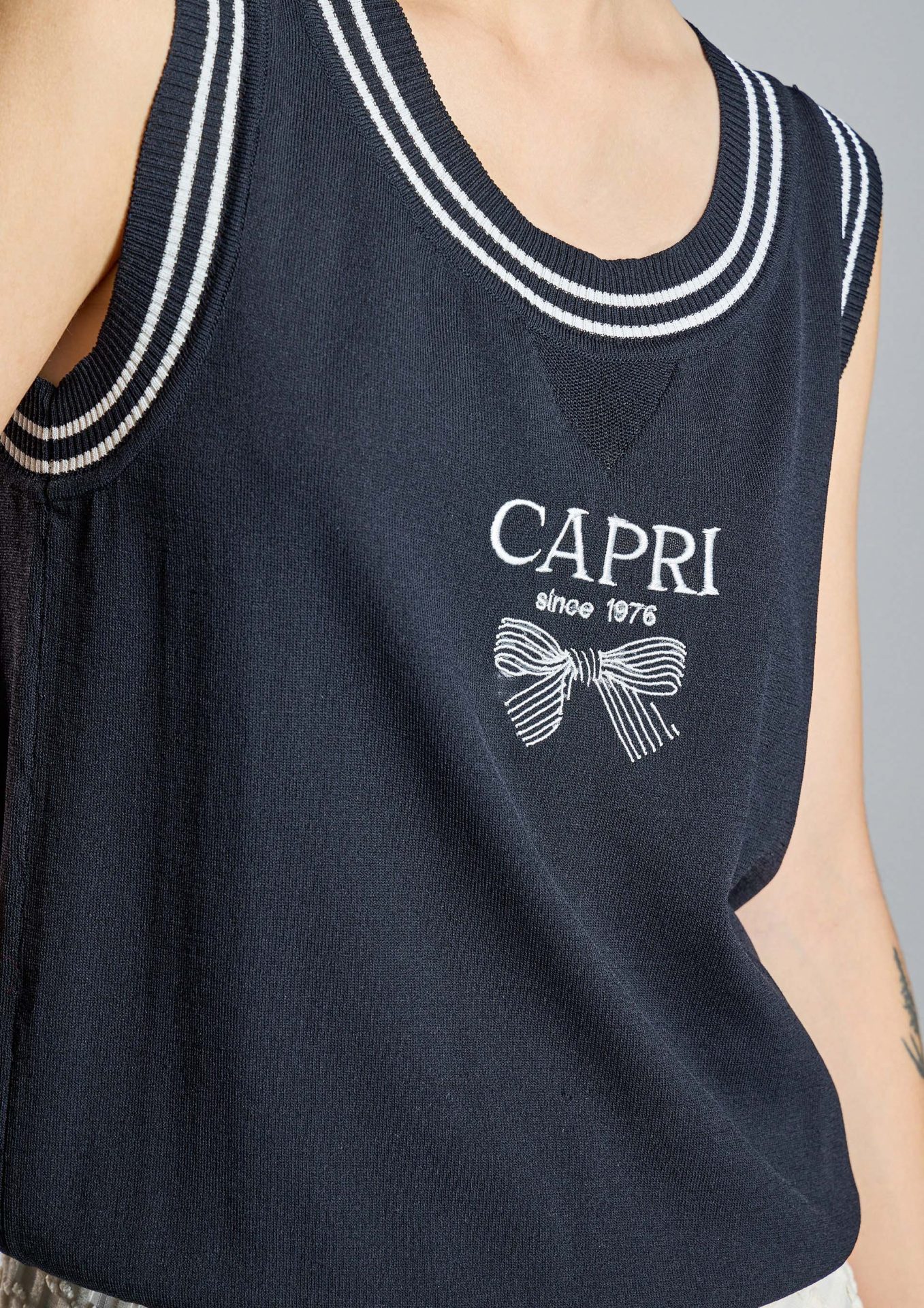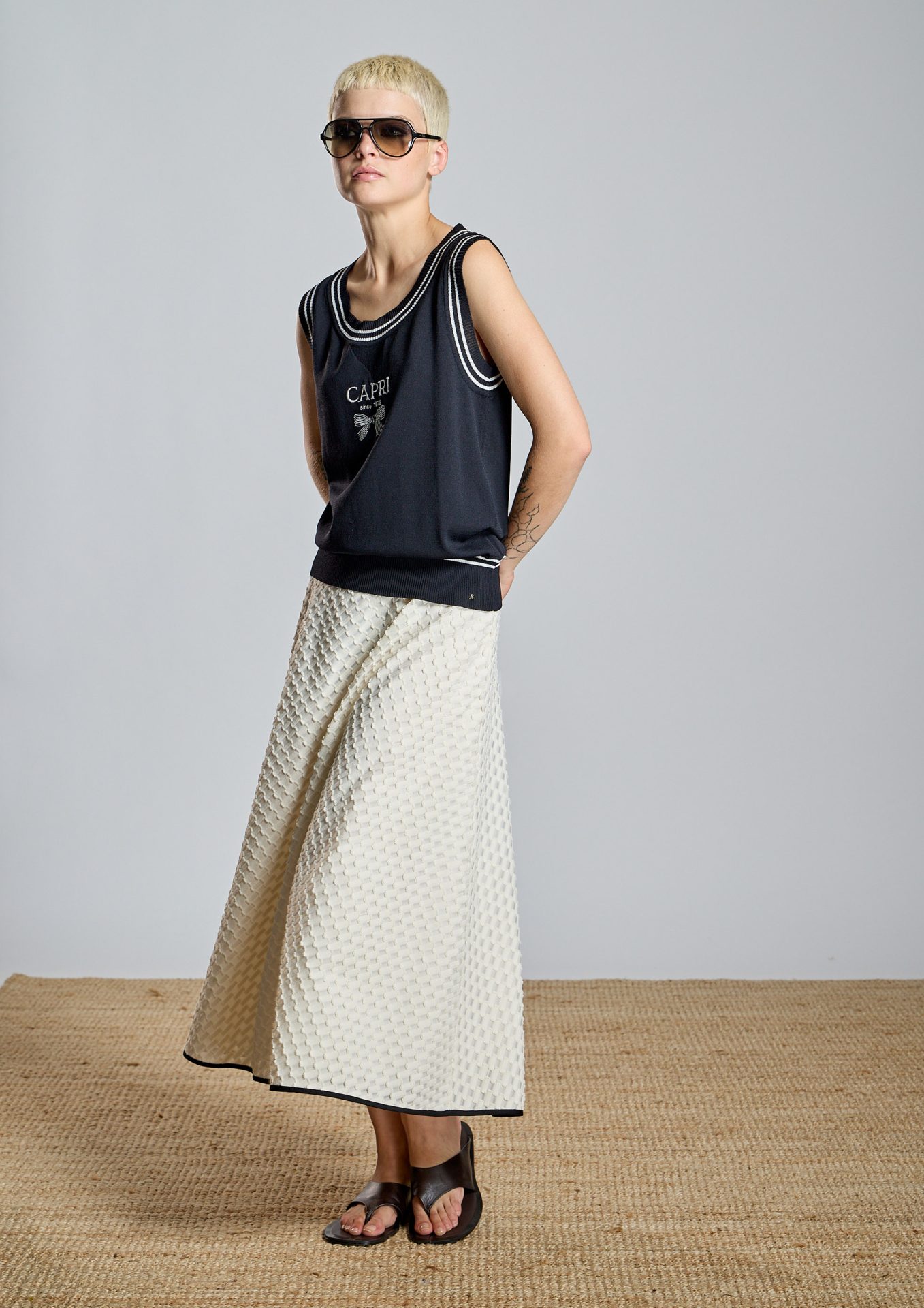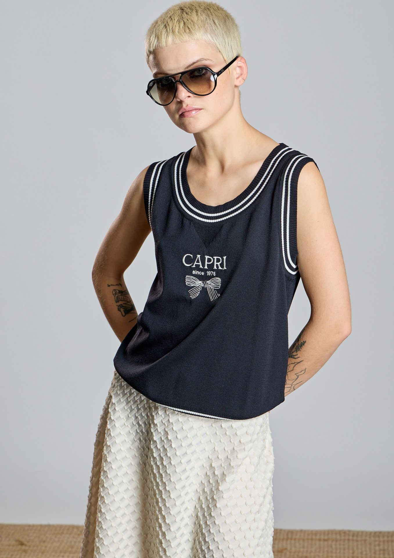 Presenta escote redondo y diseño de manga sisa, creando una silueta limpia y actual. Destaca el detalle frontal bordado con tipografía, que añade un toque retro y sofisticado.