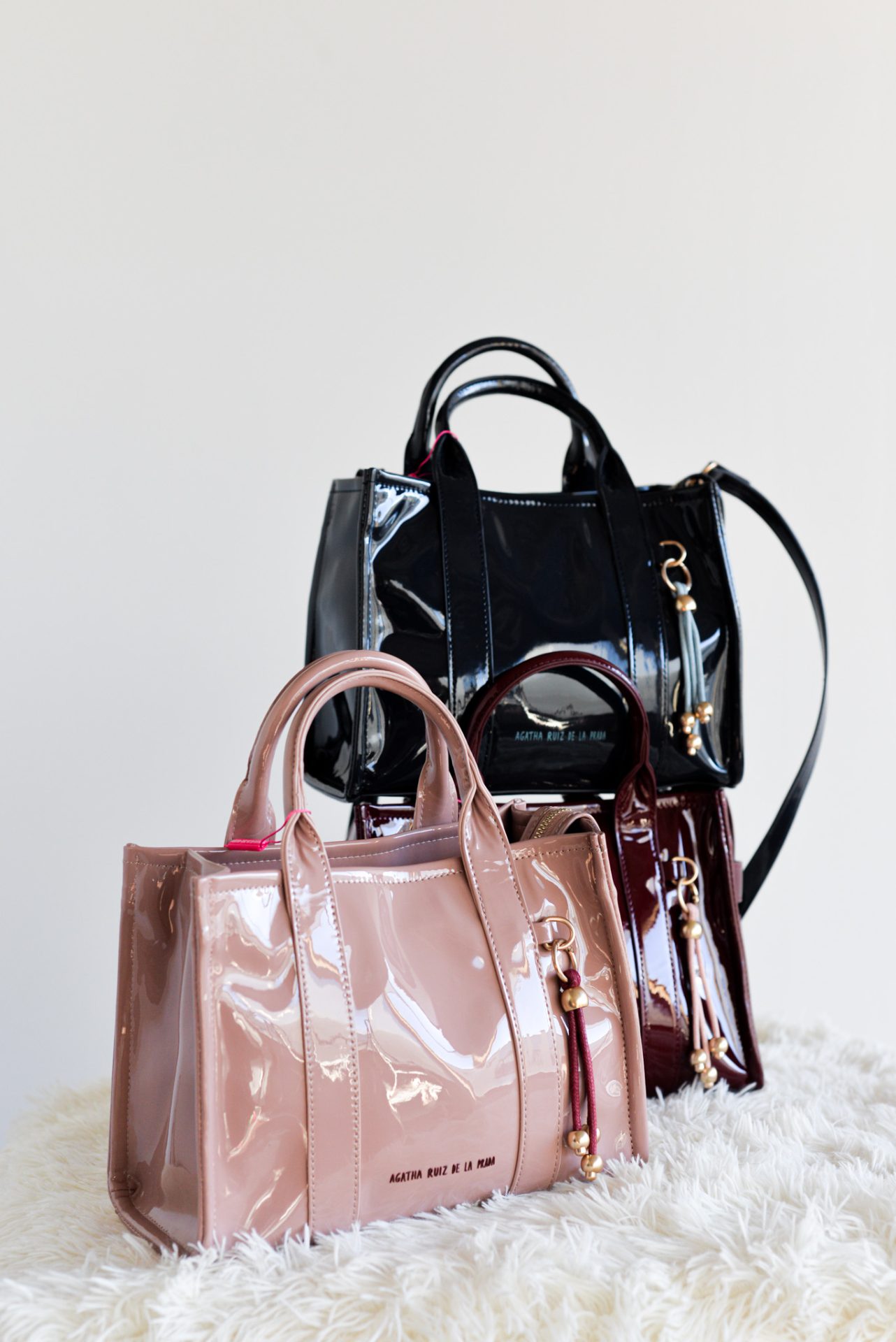 Este bolsito de mano cuadrado de charol es perfecto para quienes buscan un accesorio compacto pero con personalidad. El logo en contraste en el frontal y el pompón de cuerda a juego aportan el toque distintivo que marca la diferencia.