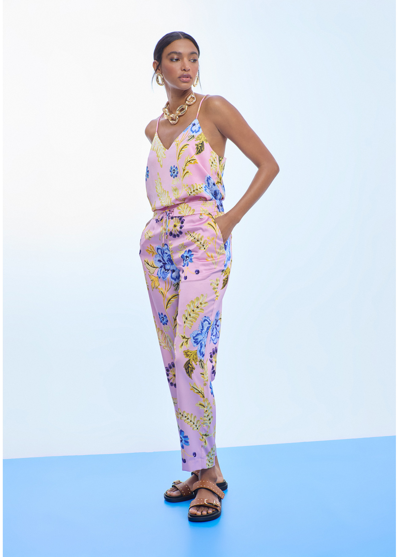 Conjunto compuesto por blusa y jogger en satén suave con estampado floral vibrante, perfecto para un look fresco, moderno y lleno de personalidad.