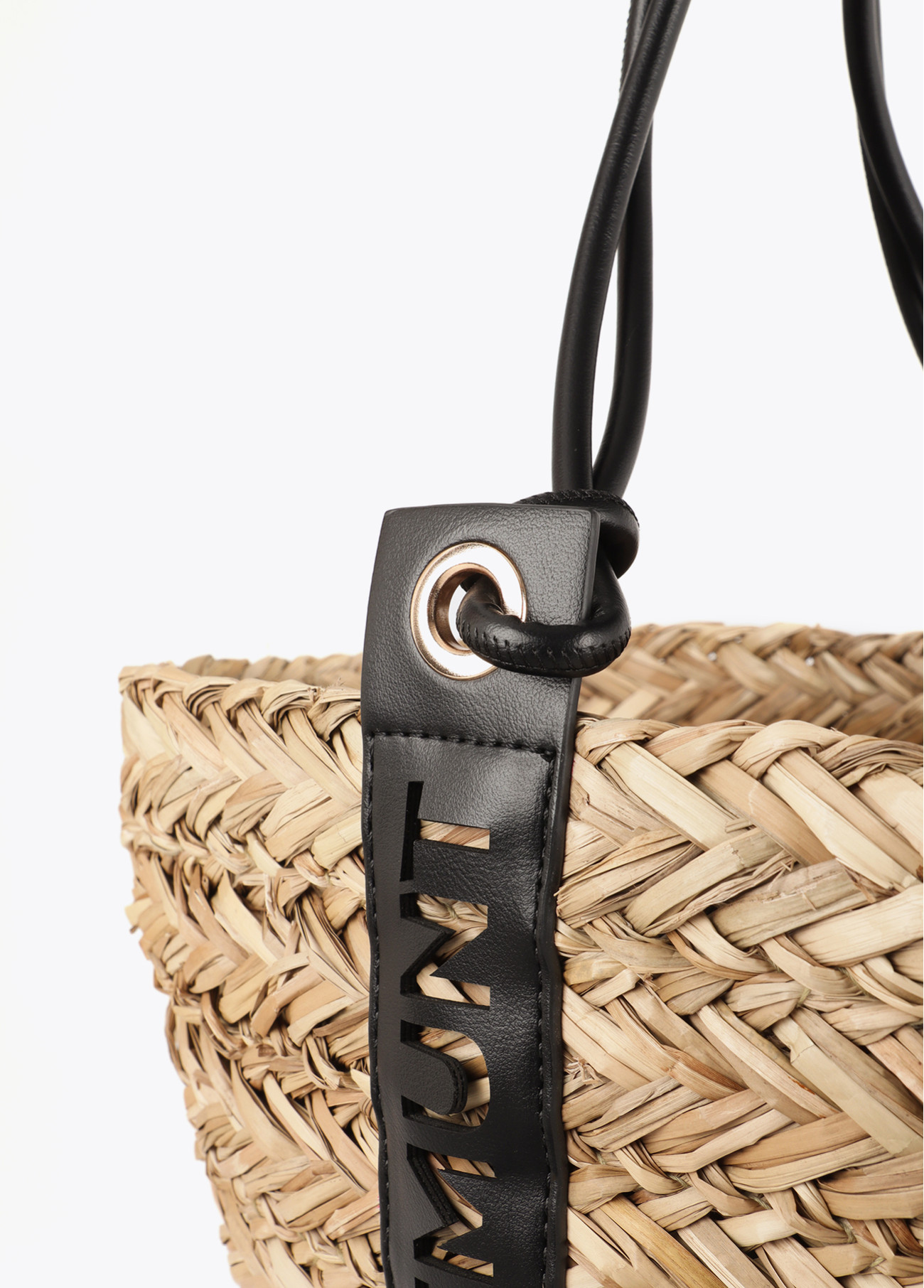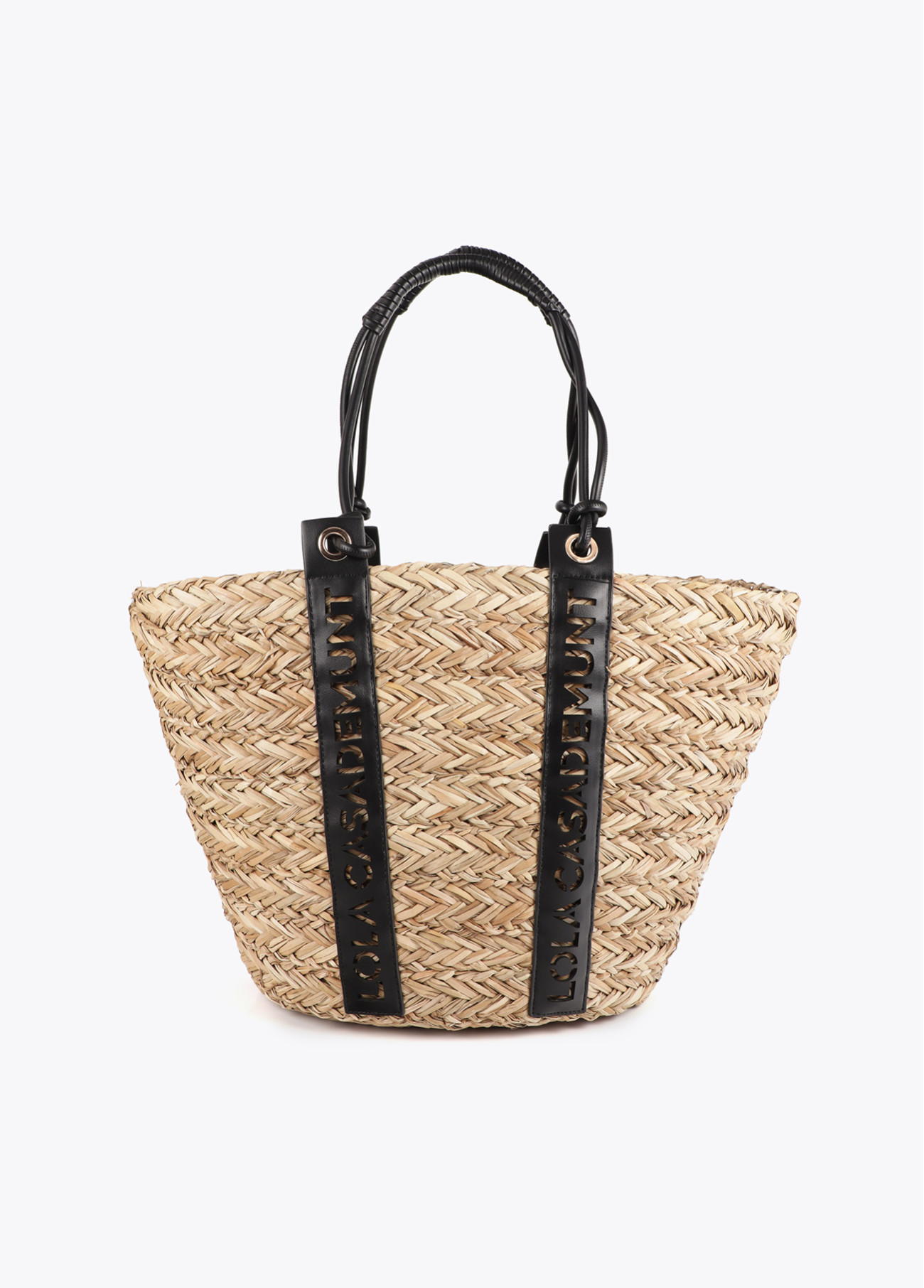 Elegante capazo de mimbre con asas en cuero sintético troquelado que realzan el logotipo de Lola Casademunt, aportando un toque distintivo y sofisticado.