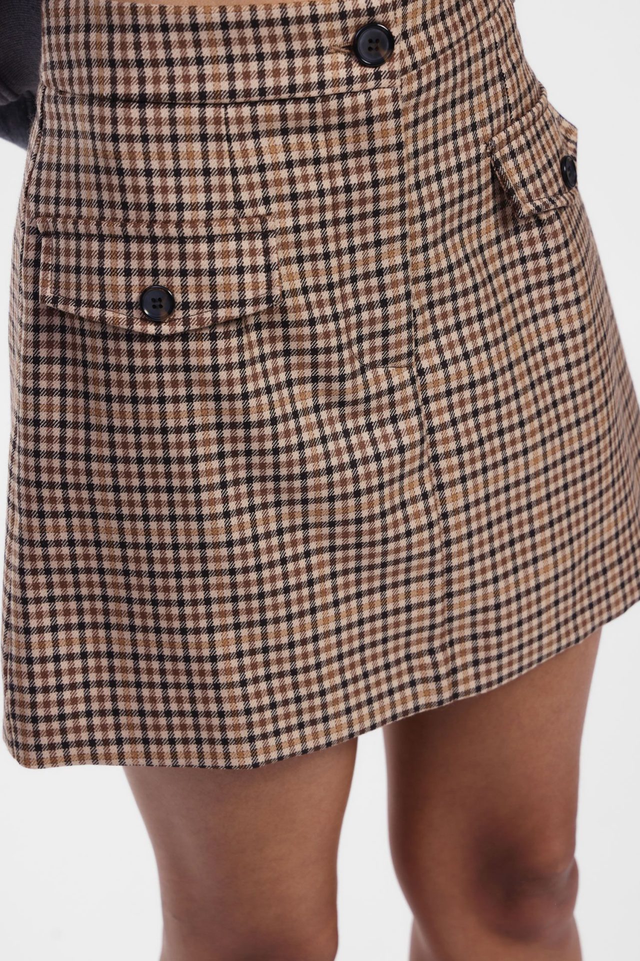 Falda corta de cuadros con botones y bolsillos frontales