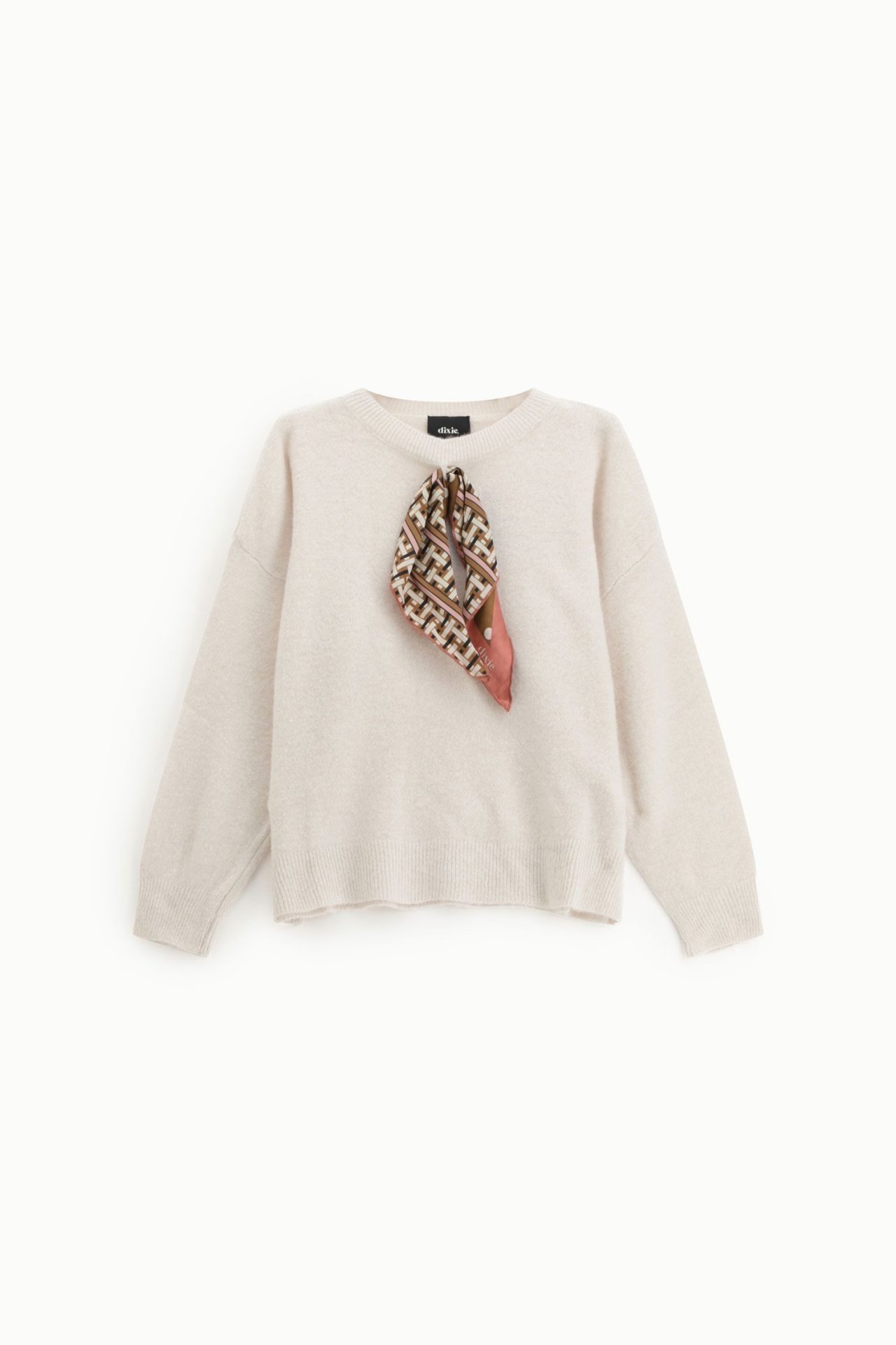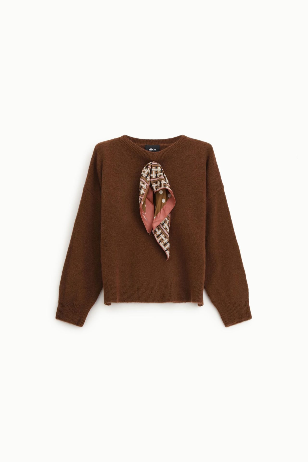 Jersey de punto suave con pañuelo decorativo frontal. Su corte fluido y versátil lo convierte en una prenda perfecta para combinar con jeans o pantalones sastre. El detalle del pañuelo aporta un toque femenino y distintivo, ideal para elevar tus looks diarios con elegancia y naturalidad.