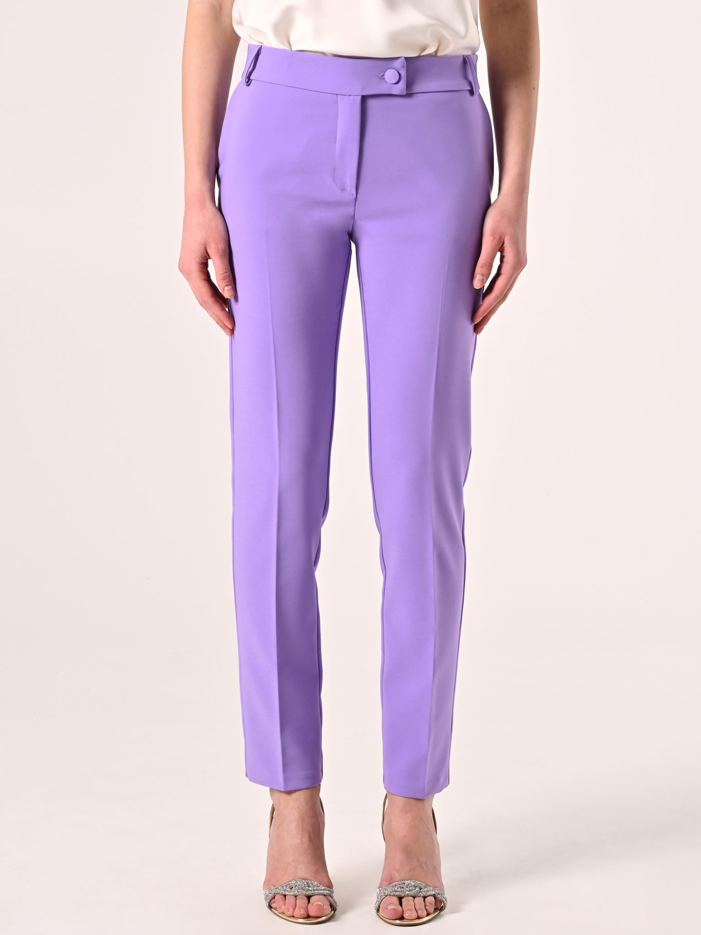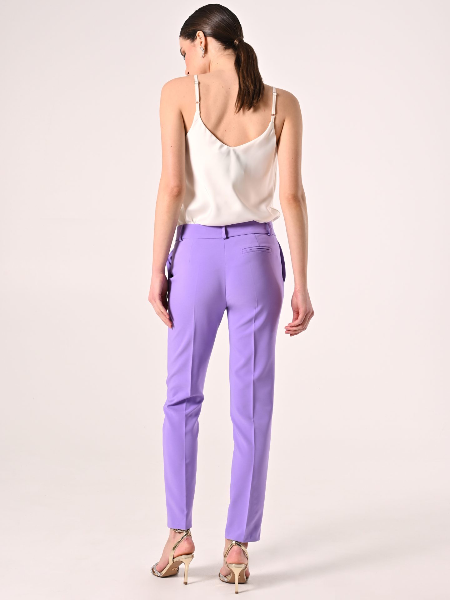 Este pantalón en tejido técnico lila es perfecto para aquellas que buscan una prenda versátil y elegante. El corte pitillo ceñido y bien definido realza la figura con un estilo discreto pero refinado, mientras que su tejido ofrece un confort óptimo. Por ello, es ideal para llevar tanto de día como de noche. Destaca por su cintura alta decorada con botones dorados, que añaden sofisticación al modelo. Los bolsillos en los laterales completan el diseño por su funcionalidad, a la vez que el cierre de cremallera invisible mantiene una línea clara y nítida. Lo podrás combinar con una blusa de seda o una chaqueta a juego, ya que se adapta de maravilla a infinidad de ocasiones, desde profesionales a casual-chic. Sin duda, ¡es todo un must-have en un fondo de armario sofisticado y moderno!