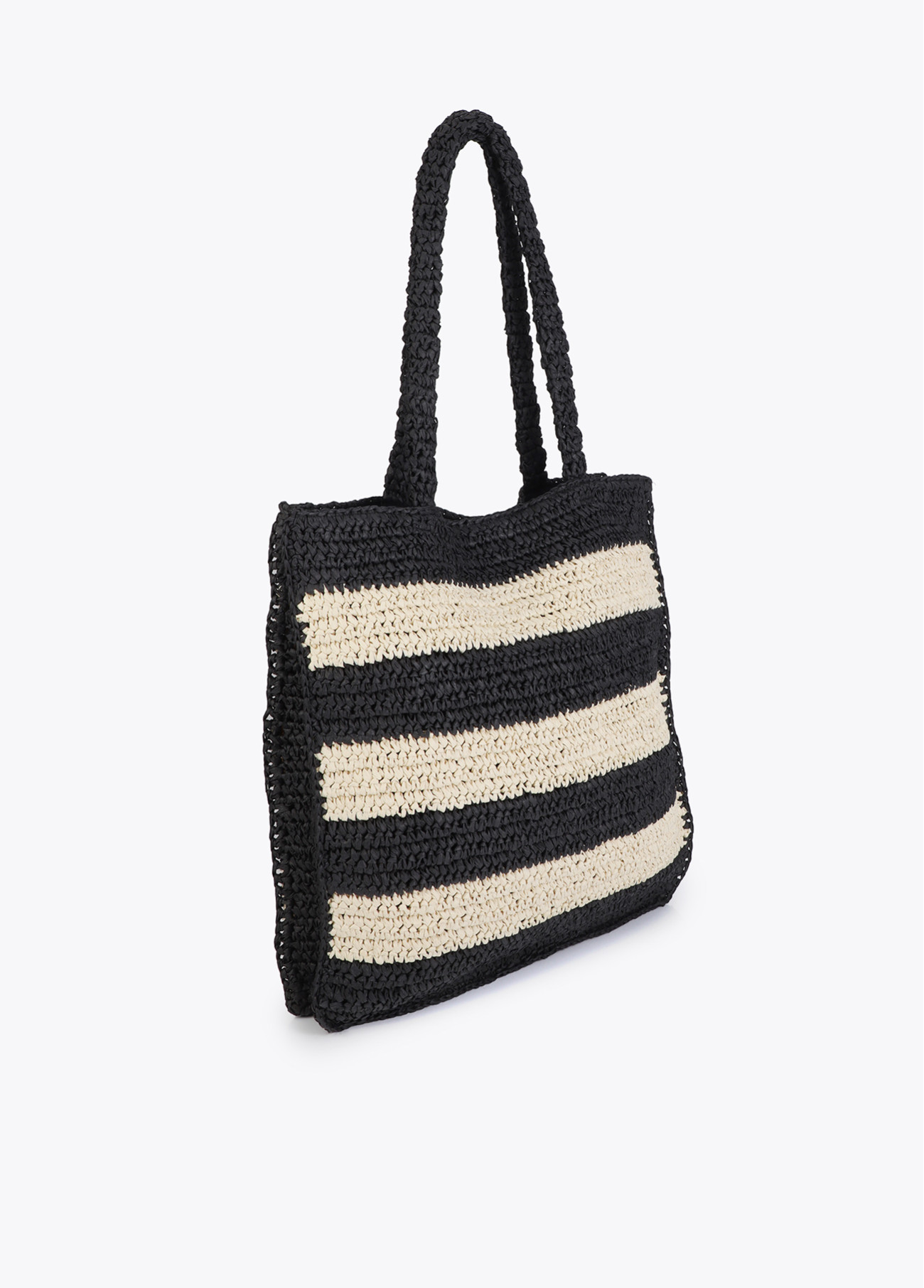 Bolso tipo shopper de rafia con elegante diseño a rayas en tonos neutros, perfecto para un estilo veraniego natural y sofisticado.