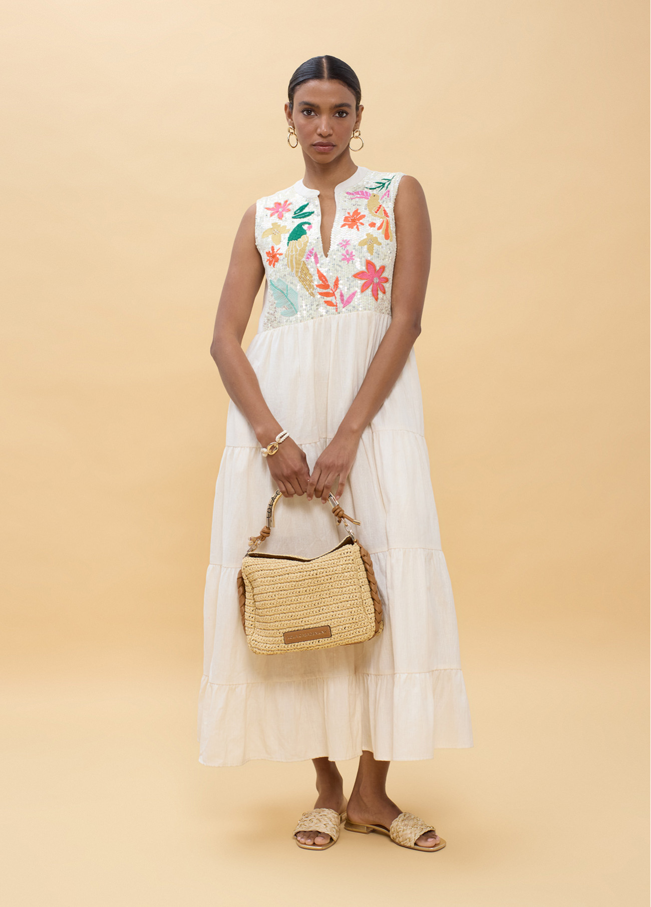 Destaca por su bordado tropical en el corpiño, con loros y flores en tonos coloridos que añaden un toque exótico y llamativo.