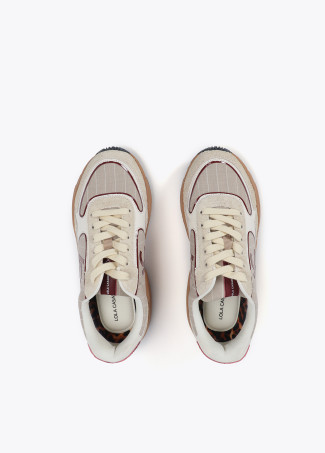 Estas zapatillas tipo running combinan comodidad y tendencia en una silueta versátil y moderna. Su diseño mezcla diferentes tejidos con piezas en piel, creando un contraste elegante y actual. El distintivo logotipo de Lola Casademunt añade un sello de identidad, mientras que el interior acolchado con detalles en estampado animal print aporta un toque de estilo único.